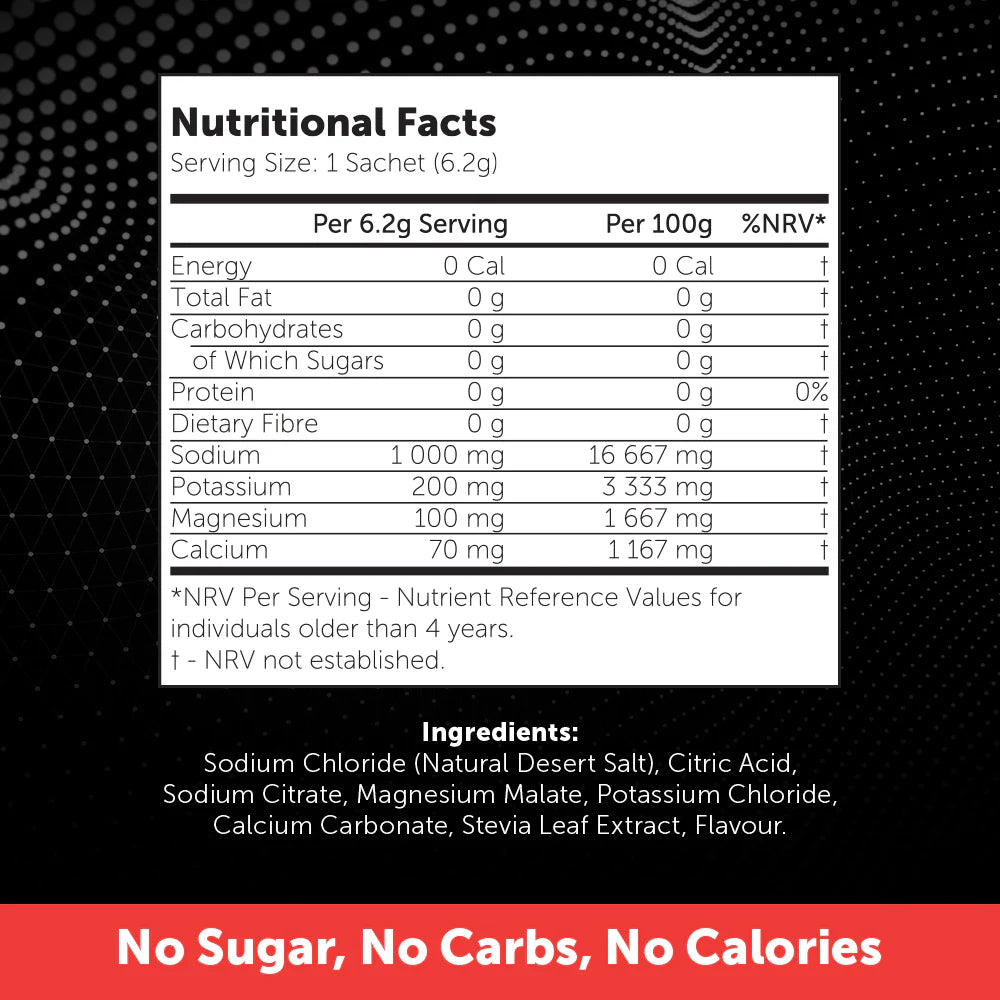 We use real, unprocessed salt from the ancient Kalahari Desert, complete with trace minerals. Our flavours are natural and carefully sourced. And our electrolyte levels are scientifically backed, with more sodium and magnesium than usual, and enough potassium to hydrate cells but not interfere with heart rhythm.